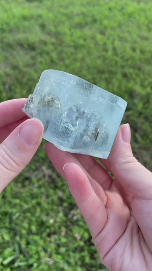 This Aquamarine crystal has grown around a cluster of Muscovite blades. Silvery Muscovite facets add a reflective interiority to this beautiful piece. From Boshat Mine, Nagar, Hunza Valley, Gilgit District, Northern Areas, Pakistan.
