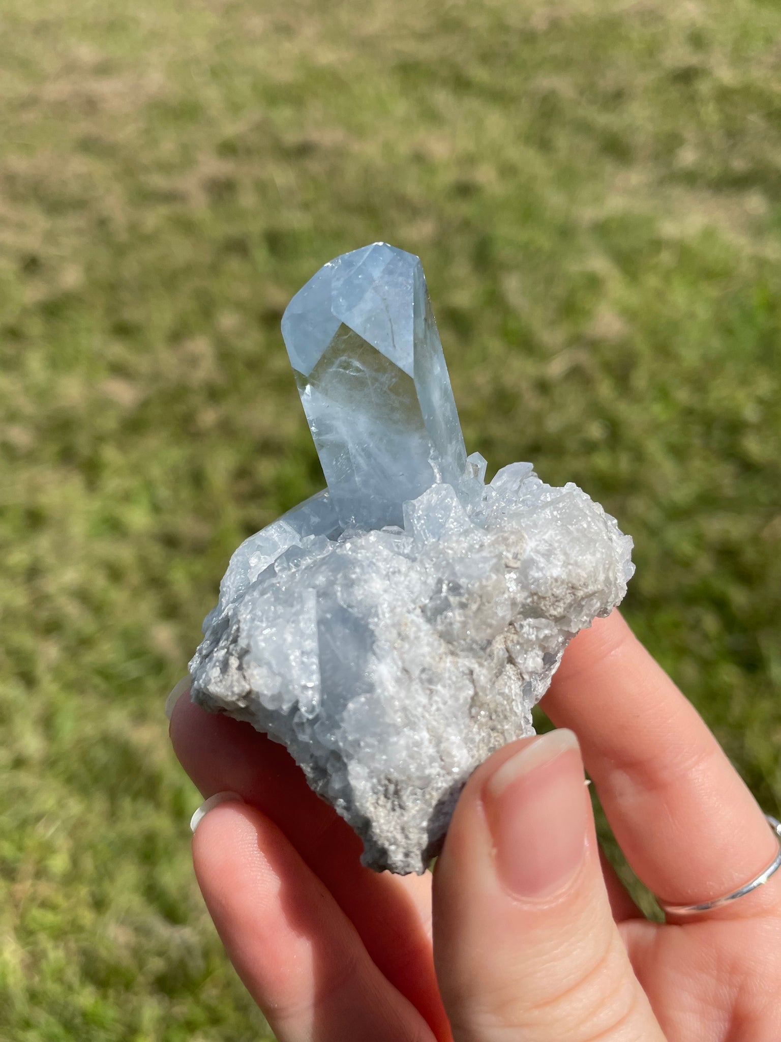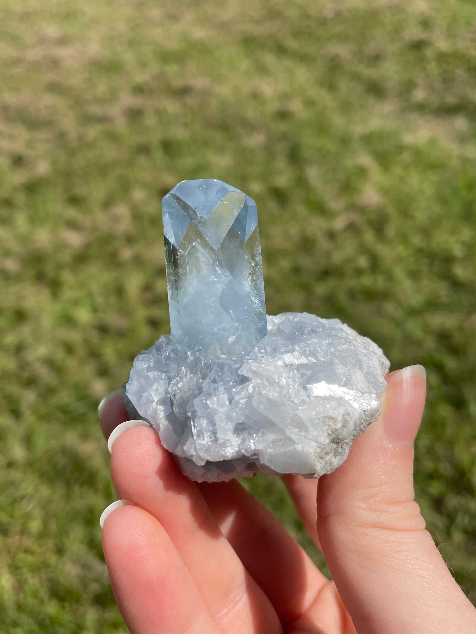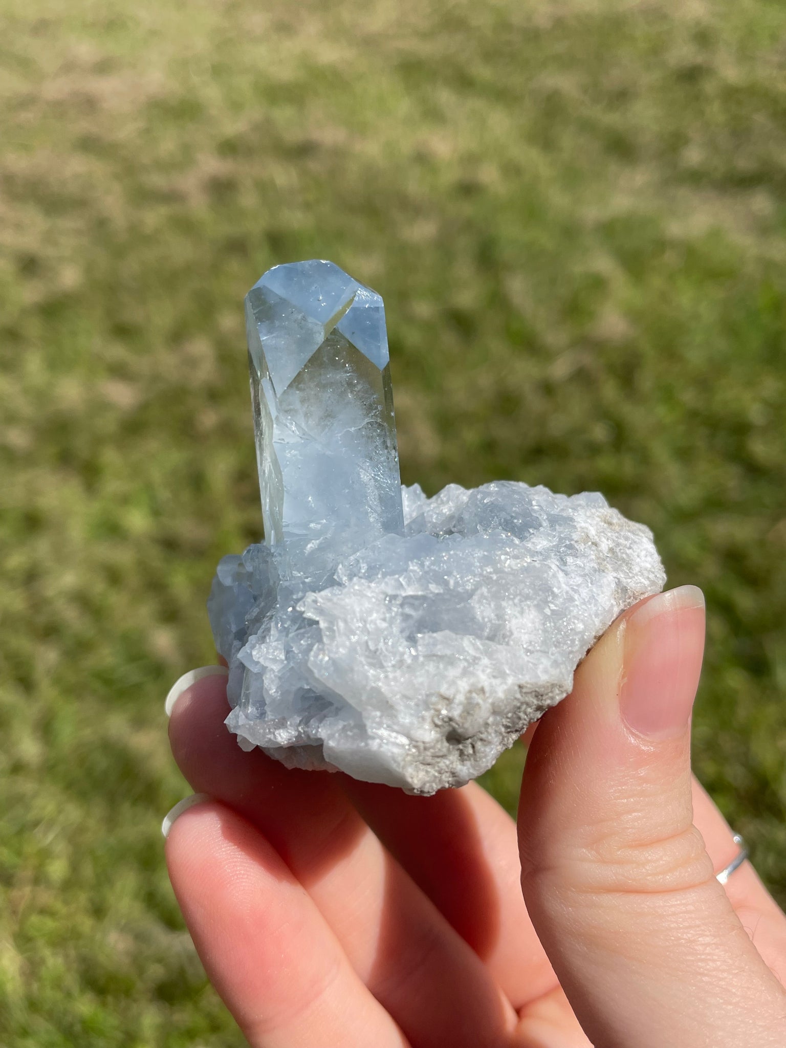 This piece features a light blue Celestite crystal rising up from matrix. The focal crystal exhibits a somewhat uncommon, rippling growth pattern on one side. From Sakoany Mine, Mitsinjo Department, Boeny Region, Mahajanga Province, Madagascar.