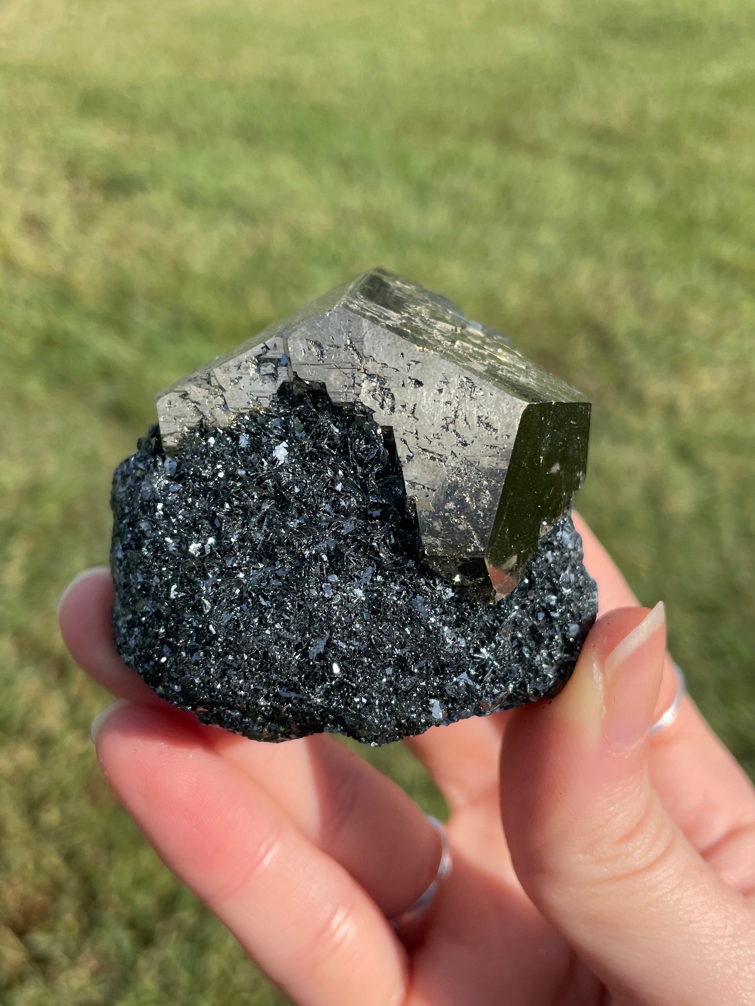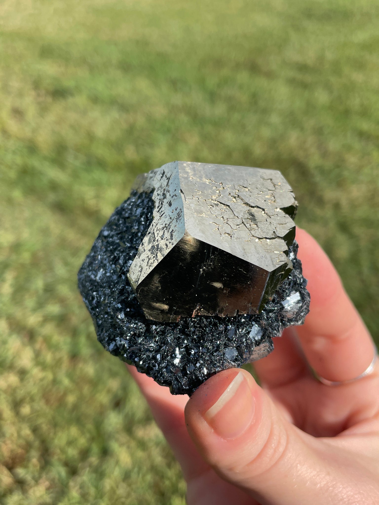 Brassy, lustrous Pyrite crystals atop a glittering black Hematite matrix. From the classic and utterly unique Pyrite locality at Elba Island, Livorno Province, Tuscany, Italy.