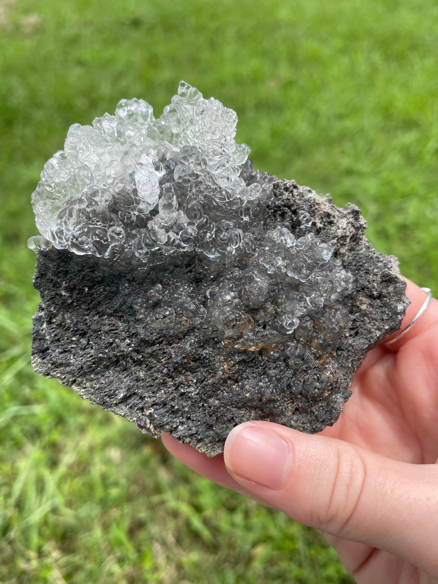 This piece features glassy, lustrous Hyalite Opal on matrix, a delightful composition for this beautiful, otherworldly-looking mineral. This specimen is from Kopasz Hill, Tarcal, Zemplen Mountains, Hungary.